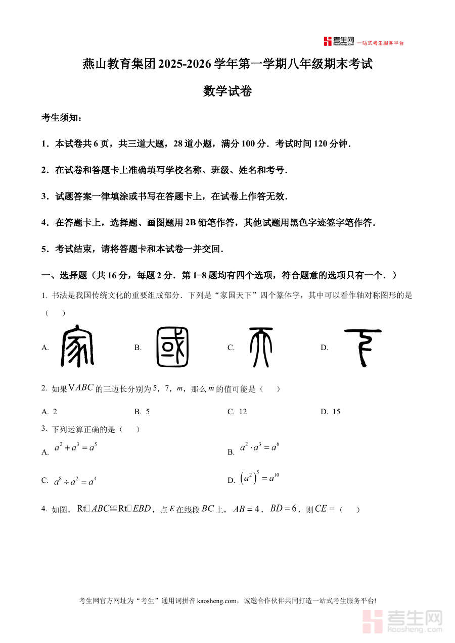 《精品解析:北京市燕山教育集团2025—2026学年上学期八年级期末考试数学试卷(原卷版)》是针对北京市燕山教育集团2025至2026学年上学期八年级数学期末考试设计的备考资料,精准对应该地区该学段期末阶段的数学学业水平评估需求,为相关教学主体提供契合区域教学实际的考试资源支持。