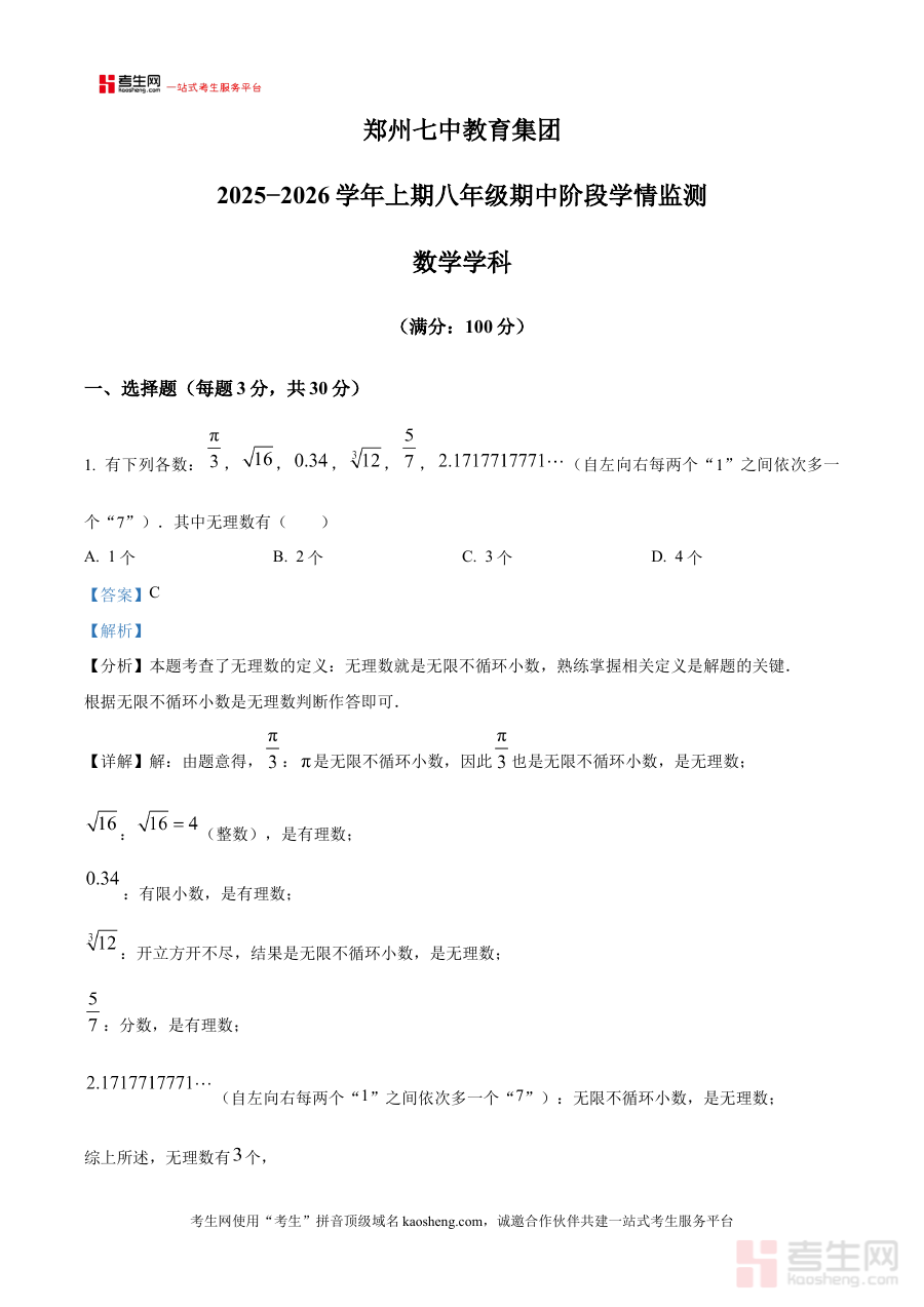 本资料适用于河南省郑州七中教育集团2025-2026学年八年级学生进行期中数学考试的复习备考,也可供该集团数学教师作为教学参考或检测分析的辅助材料,其解析内容能有效提升使用者对期中阶段数学知识掌握情况的认知,助力高效备考与教学优化。