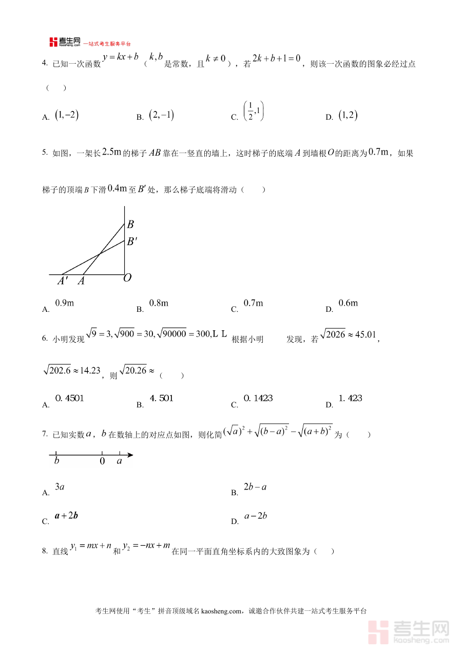 该资料作为原卷版试题,能够帮助学生直观感知本校期中数学考试的整体框架与考查重点方向,便于学生开展阶段性的学情自我诊断,清晰识别自身在数学学习过程中的知识掌握程度与能力短板;同时,它也可为数学教师提供与本校期中考试直接相关的试题参考,辅助教师进行教学效果评估与后续教学计划调整,还能为家长提供了解孩子学习状况的有效载体,助力家长与学校协同制定更科学的备考规划与学习指导方案。