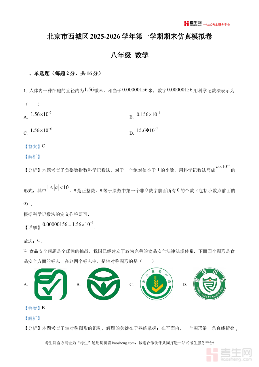《精品解析:北京市西城区2025-2026学年上学期八年级数学期末仿真模拟卷(解析版)》是针对北京市西城区2025-2026学年上学期八年级数学期末考试设计的仿真模拟备考资料,贴合该地区同期教学进度与考试要求,为学生提供与真实考试场景高度一致的练习载体。