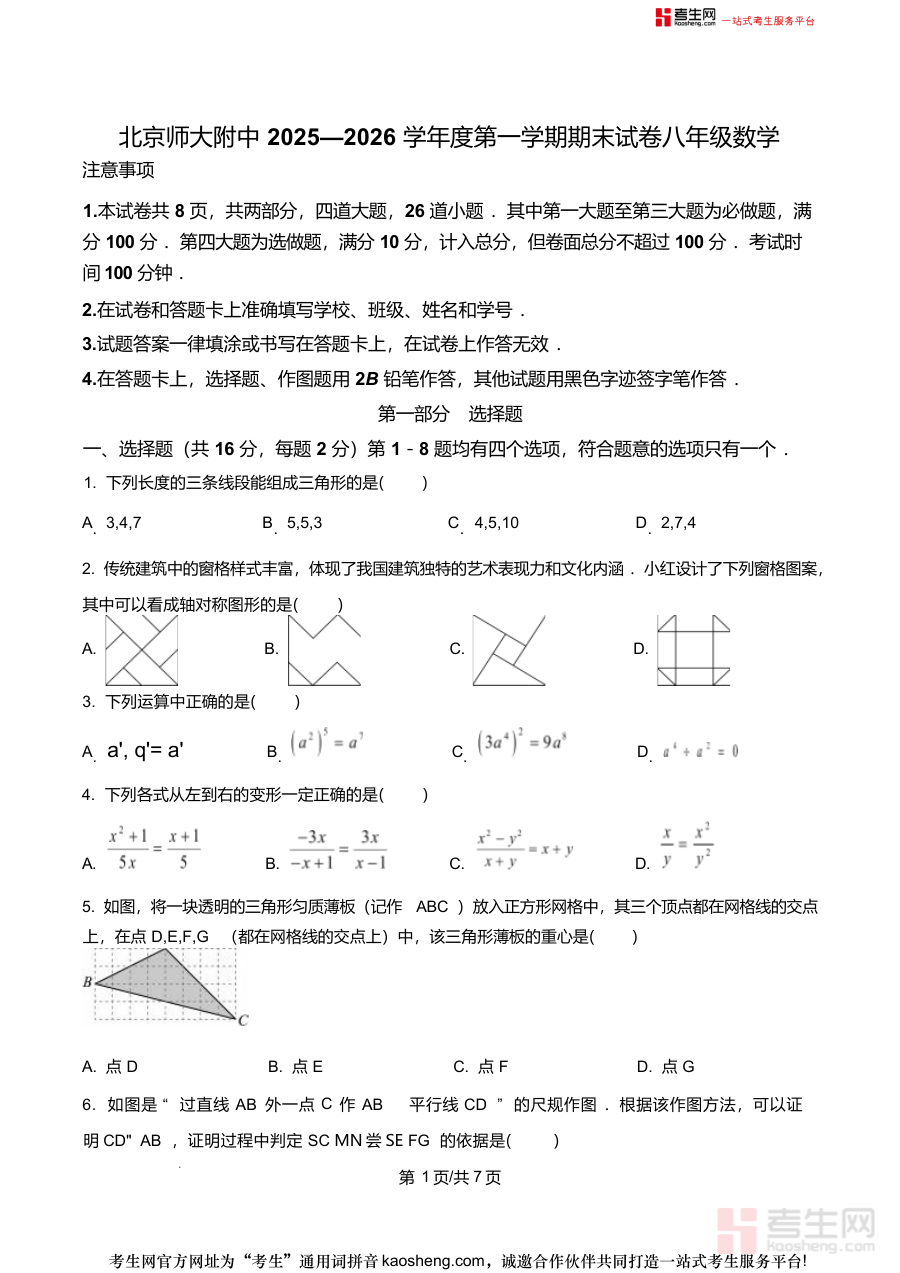 《精品解析:北京市西城区北京师范大学附属中学2025-2026学年上学期八年级期末数学试题(原卷版)》是针对北京市西城区北京师范大学附属中学2025-2026学年上学期八年级期末数学考试的备考资料,聚焦该阶段数学学科的期末检测需求,为学生提供贴合校考实际的练习载体。