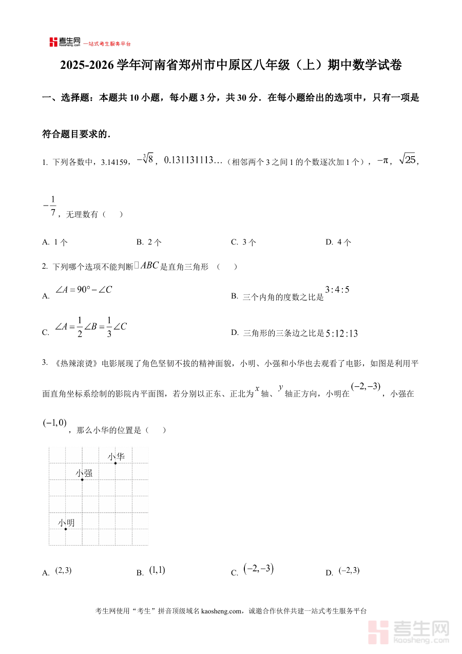 《精品解析:河南省郑州市中原区2025-2026学年八年级上学期期中数学试卷(原卷版)》是针对河南省郑州市中原区2025至2026学年八年级上学期数学期中考试设计的原卷形式备考资料,精准对应该地区该学年八年级学生的期中数学考试需求,能够为使用者提供与实际考试形式高度一致的练习载体,帮助其提前熟悉考试的整体框架和呈现方式。