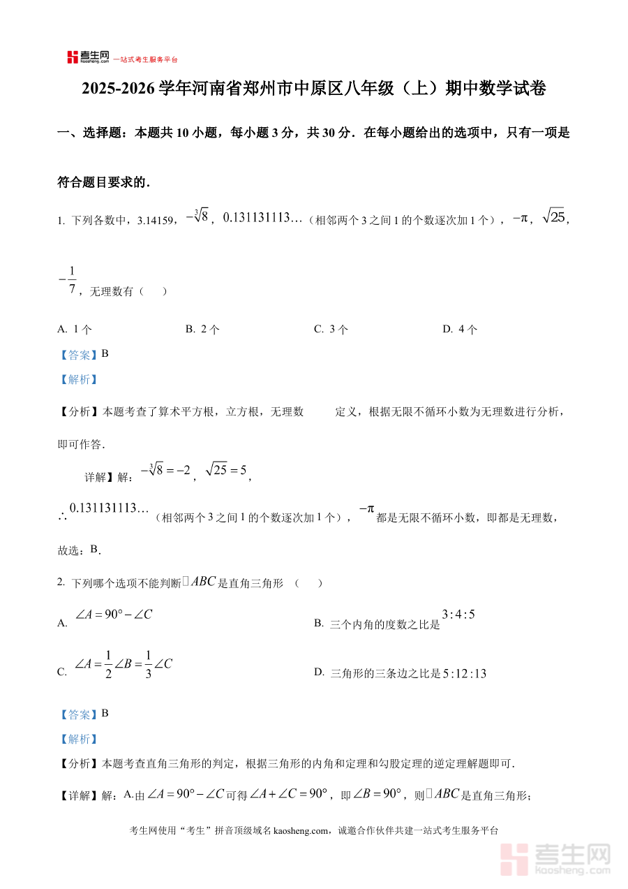 《精品解析:河南省郑州市中原区2025-2026学年八年级上学期期中数学试卷(解析版)》是针对河南省郑州市中原区2025-2026学年八年级上学期期中数学考试的专业备考资料,聚焦该区域特定学年段的期中数学测评场景,为使用者提供与本地考试方向高度匹配的参考内容。