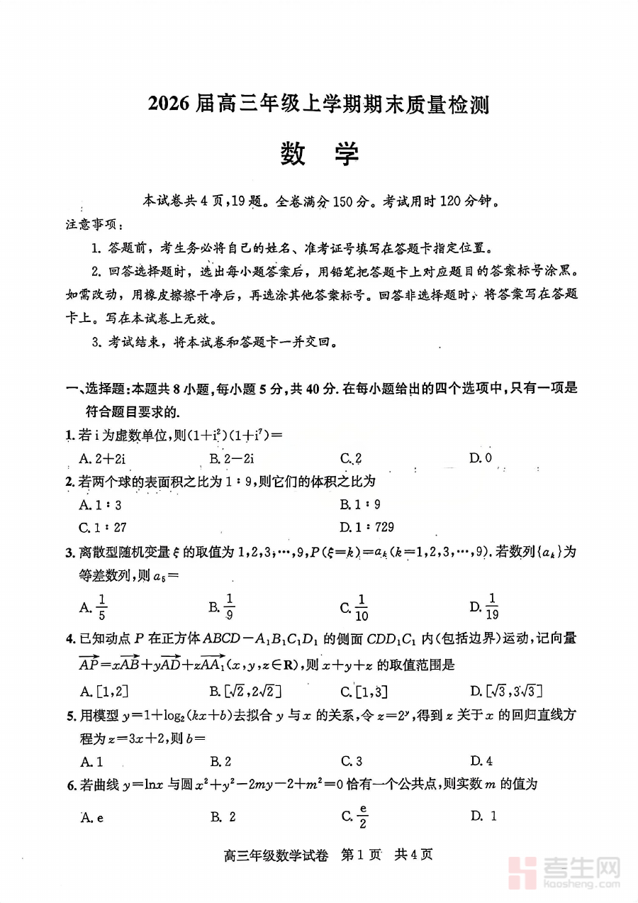该试卷适用于2026届武昌区高三全体学生、担任该年级数学教学的教师及关注学生备考情况的家长。对于学生而言,它是自我检测与调整复习策略的重要工具;对于教师,它是了解学生群体学习状况、制定个性化教学方案的参考依据;对于家长,它能帮助其清晰把握孩子的数学学习进度与水平,更好配合学校和孩子完成备考准备工作,共同助力学生在元调考试中取得理想成绩。