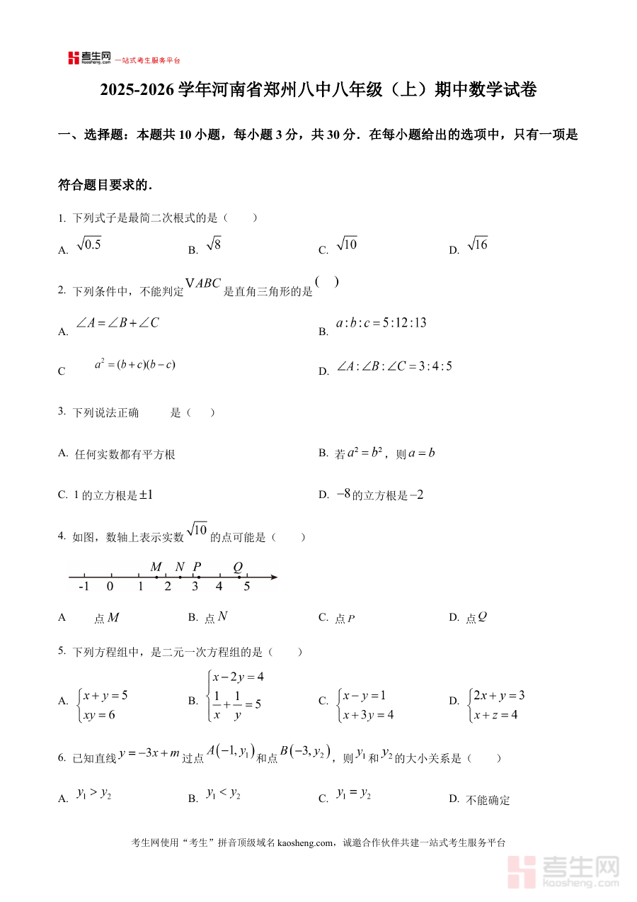 《精品解析:河南省郑州市第八中学2025-2026学年八年级上学期期中数学试卷(原卷版)》是针对河南省郑州市第八中学2025至2026学年八年级上学期期中数学考试的专用备考资料,精准对应该学校该学年该阶段的数学教学进度与考试要求,以原卷形式呈现,能为使用者提供最贴近实际考试场景的练习载体。