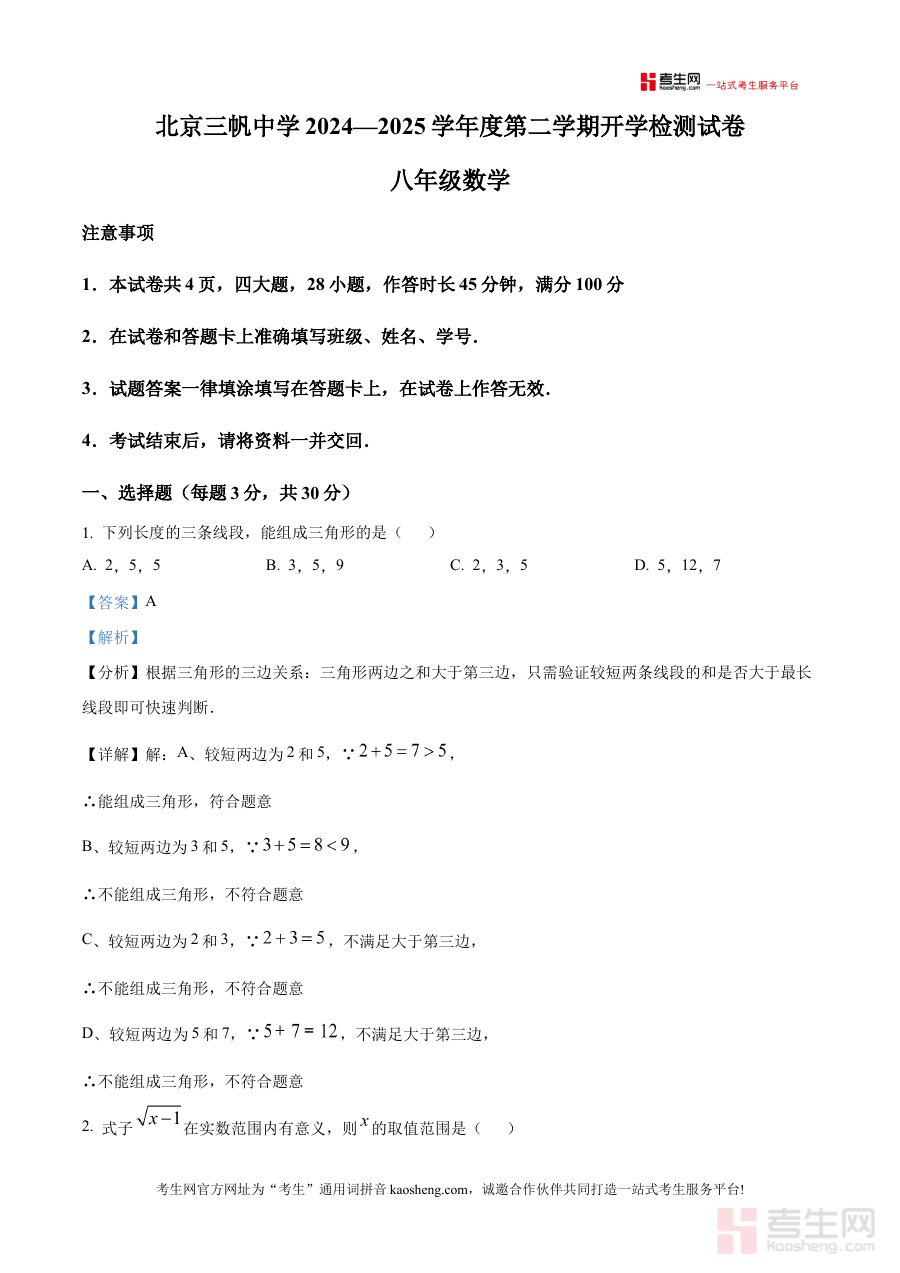 此资料适用于北京三帆中学2024—2025学年度八年级下学期的学生群体,其价值在于通过专业解析内容助力学生完成阶段检测后的自我评估,优化备考规划的针对性与有效性,进而提升数学学习的整体效率与质量,为后续学习阶段的知识巩固与能力提升奠定基础。