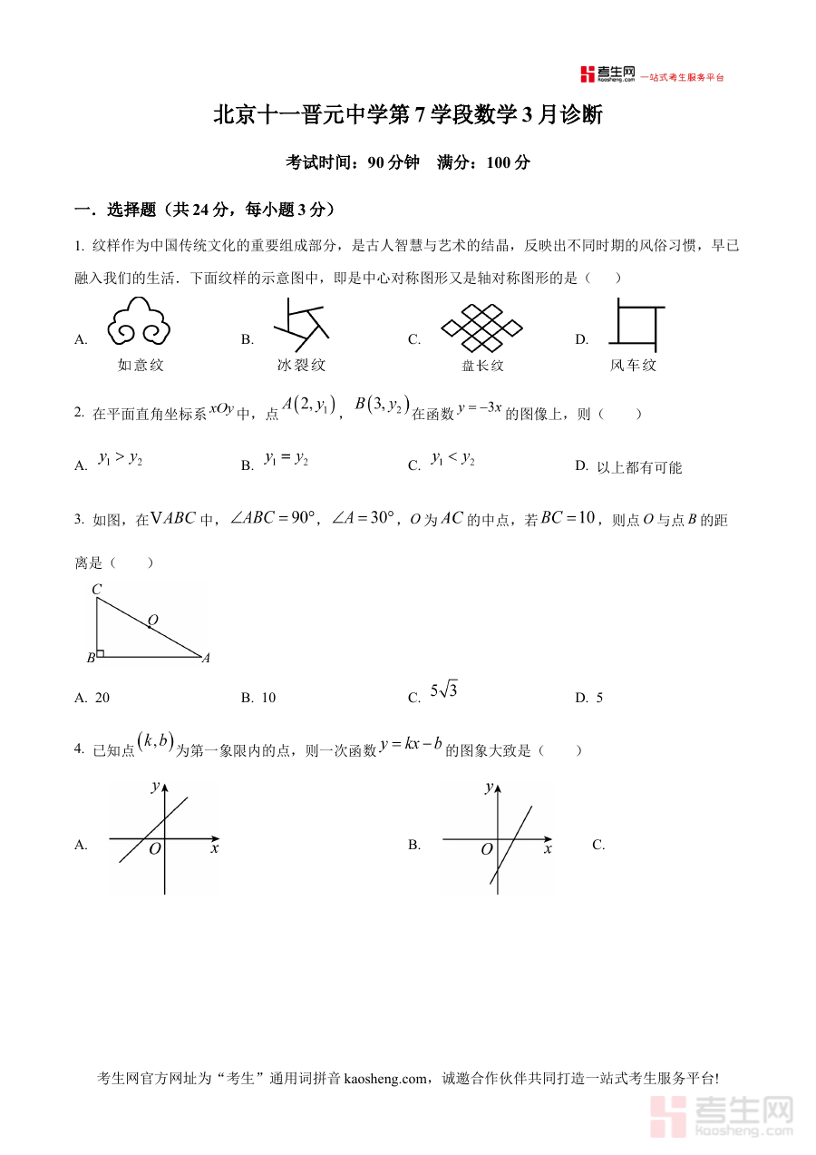 《精品解析:北京市海淀区十一晋元中学2024~2025学年下学期3月月考八年级数学试卷(原卷版)》是针对2024至2025学年下学期北京市海淀区十一晋元中学八年级学生的数学阶段性考试资料,属于该校3月份月考的原卷版本,可作为该年级学生数学学科阶段性学习的备考参考资料。