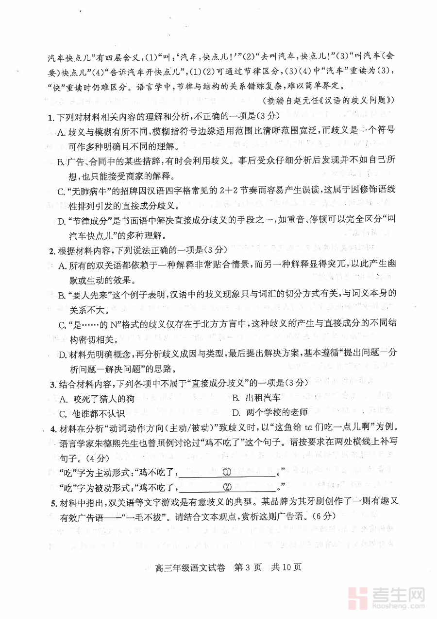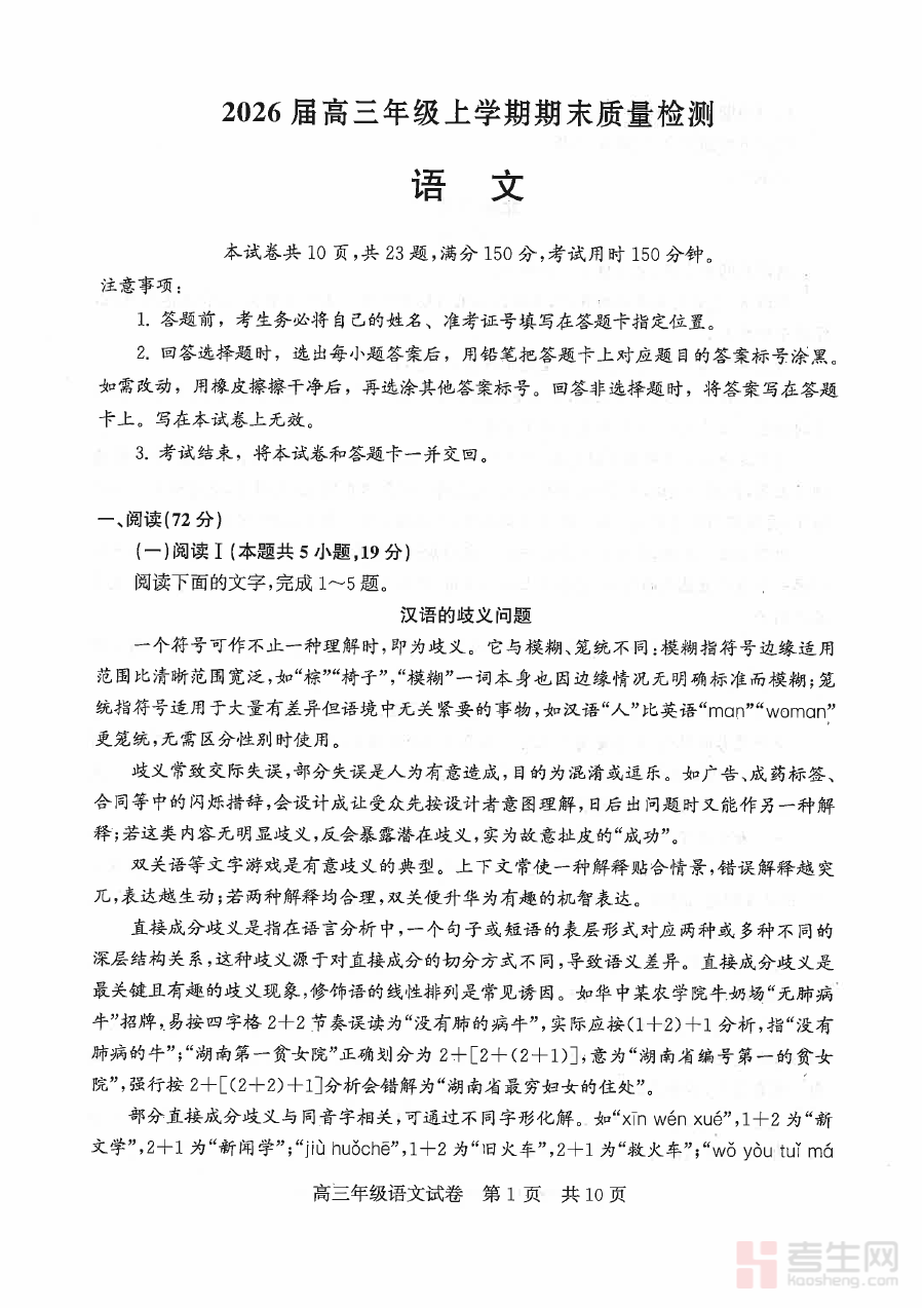 本试卷主要适用于2026届武昌区高三在读学生及从事高三语文教学的教师群体。对于学生而言,使用该试卷进行模拟练习或阶段检测,能够提前适应元调考试的题型结构与时间安排,明确备考重点方向,提升备考的针对性与有效性;对于教师而言,借助试卷分析学生的学习情况,可制定更具个性化的指导方案,助力学生在高三语文备考中稳步提升,为后续的高考冲刺奠定坚实基础。