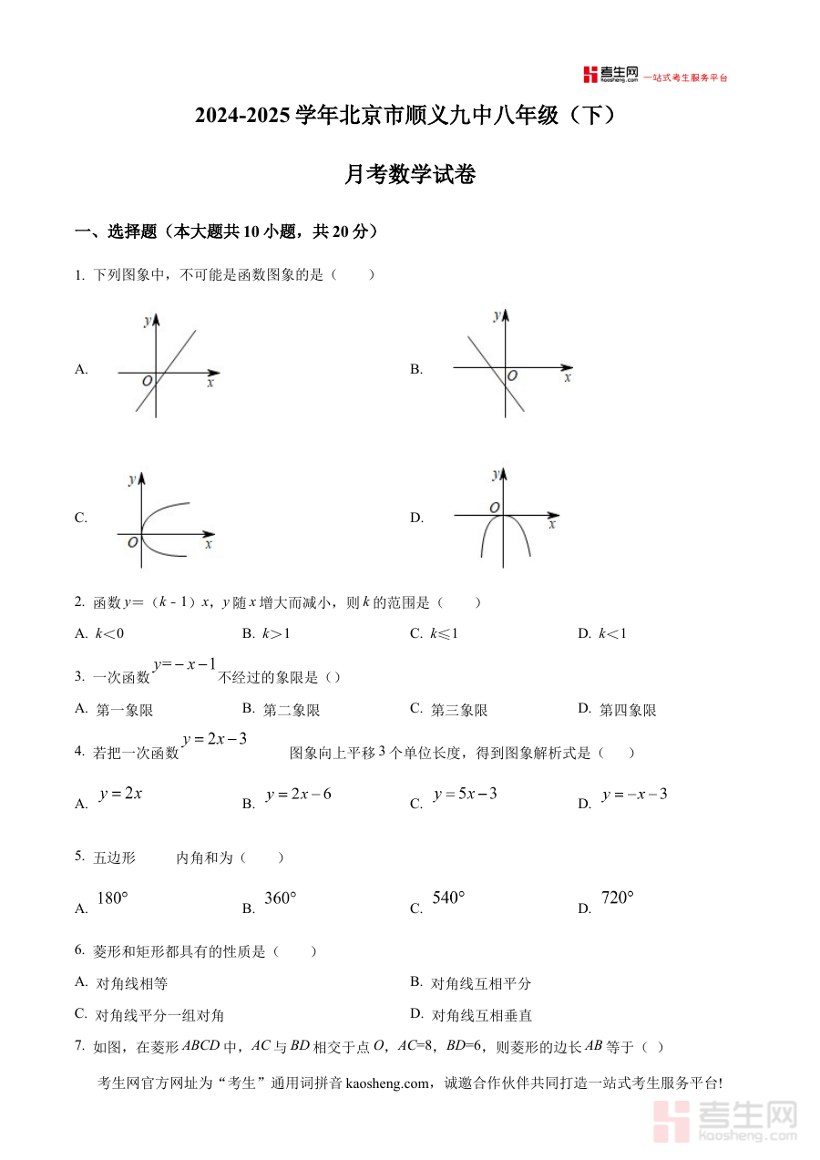 《精品解析:北京市顺义区顺义第九中学2024-2025学年八年级下学期月考数学试卷(原卷版)》是针对北京市顺义区顺义第九中学2024至2025学年八年级下学期数学月考设计的备考资料,精准贴合该校该学年该阶段的数学教学进度与考试要求,包含该次月考的原卷内容,能够真实反映该校八年级下学期数学阶段性考试的考查方向与实际考试场景,为相关使用者提供贴近学校考试实际情况的参考依据。