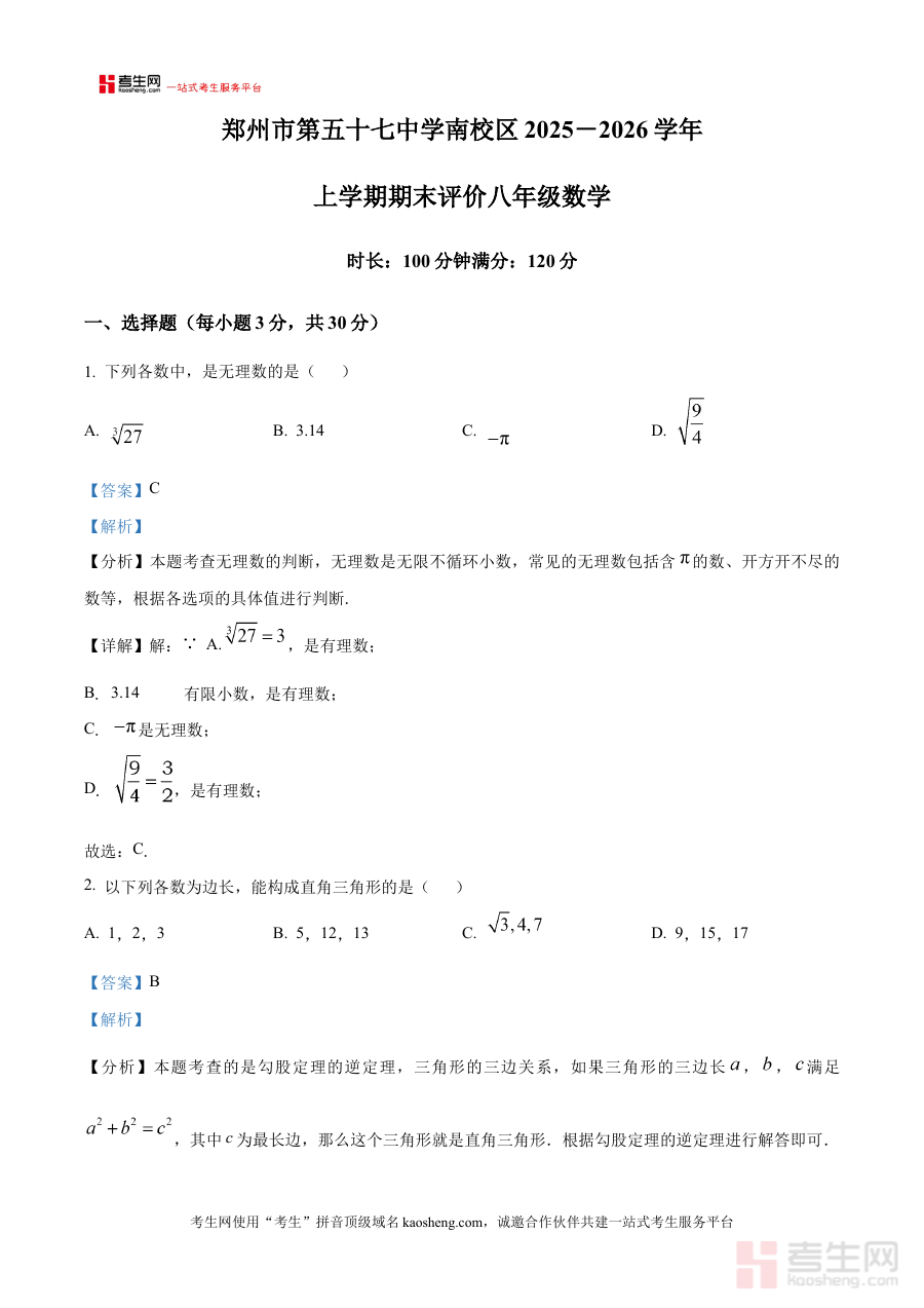 本资料适用于河南省郑州市第五十七中学南校2025-2026学年上学期的八年级学生,通过对期末评价的解析,能有效提升学生对数学知识的理解与应用能力,为阶段检测后的查漏补缺及下一阶段学习规划提供实用价值。