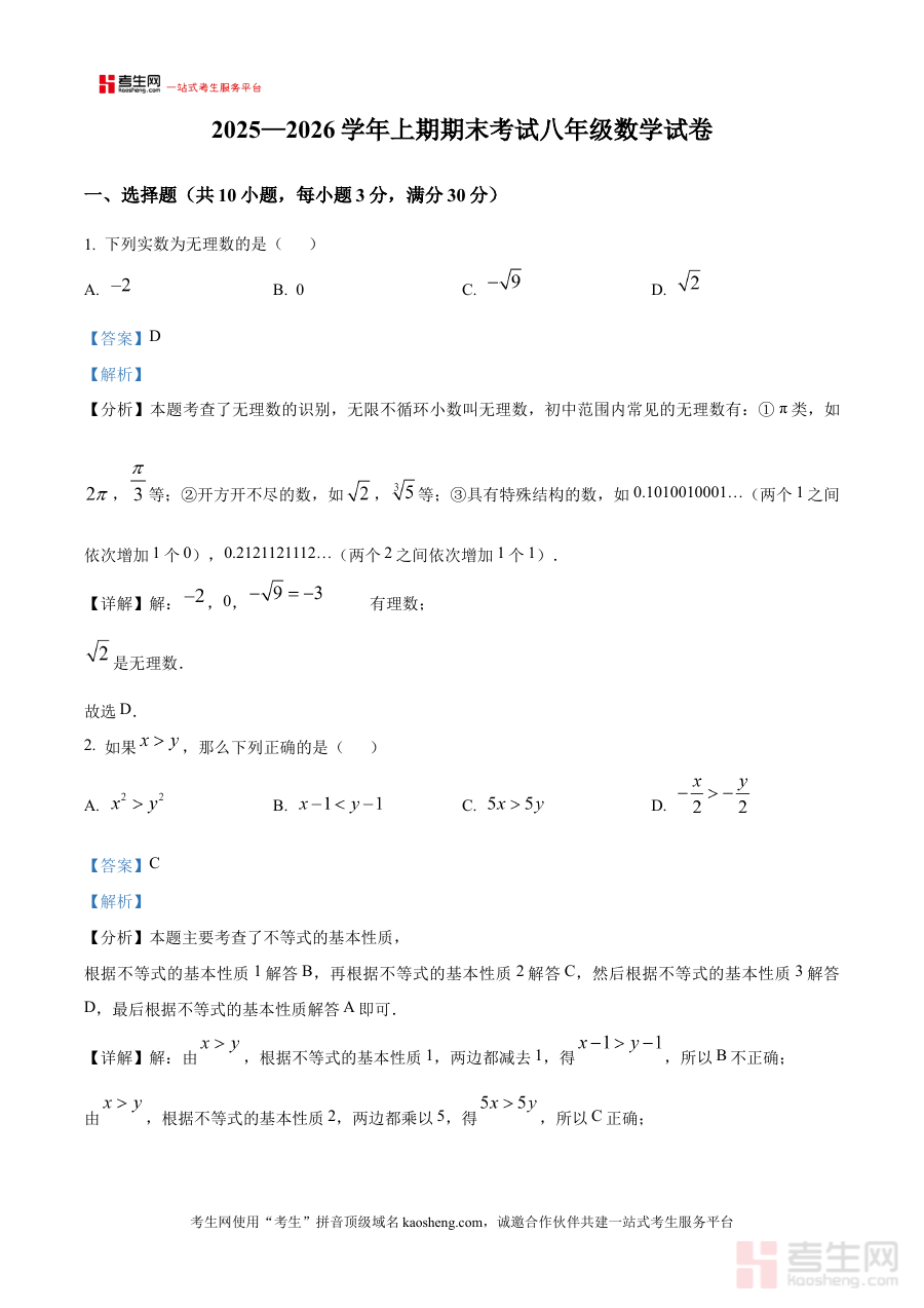 本资料适用于河南省郑州市第八中学2025-2026学年八年级学生,作为期末复习阶段的重要参考资料,其解析内容有助于学生把握考试重点与答题思路,提升阶段检测的应对能力,同时也可为教师或家长提供了解学生学习状况的辅助工具。