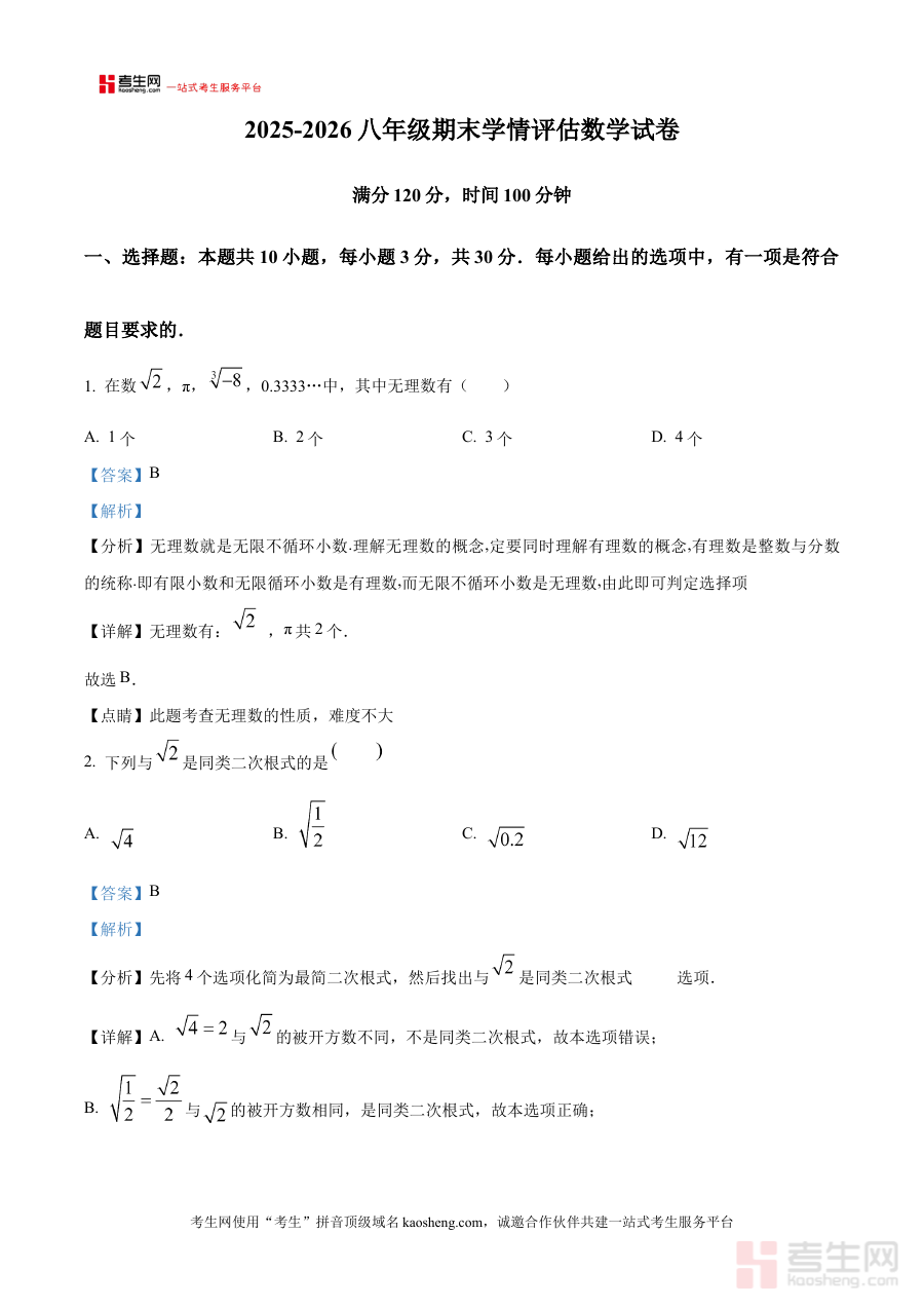 《精品解析:河南省郑州市西一中学2025-2026学年上学期八年级期末学情评估数学试卷(解析版)》是面向河南省郑州市西一中学2025-2026学年上学期八年级学生的数学期末学情评估专项备考资料,精准对应该学年上学期期末学情评估的考试类型,为使用者提供与考试高度匹配的解析支持。