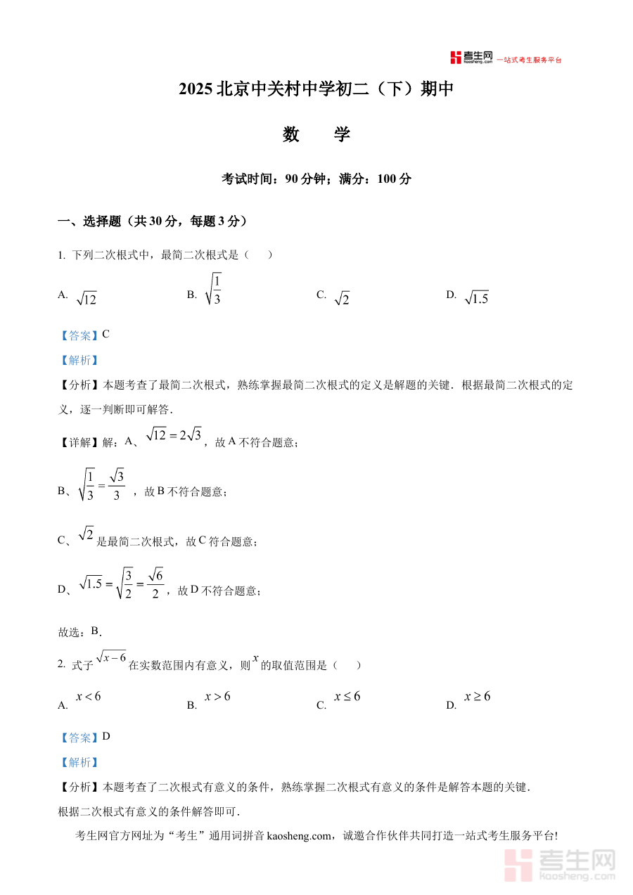 《精品解析:北京中关村中学2024-2025学年八年级数学下学期期中数学试题(解析版)》是北京中关村中学针对2024-2025学年八年级学生数学学科下学期期中检测推出的配套解析资料,紧密贴合该校该学年段的数学教学进度与期中考查目标,为相关使用者提供了与学校实际考试直接关联的权威参考依据。