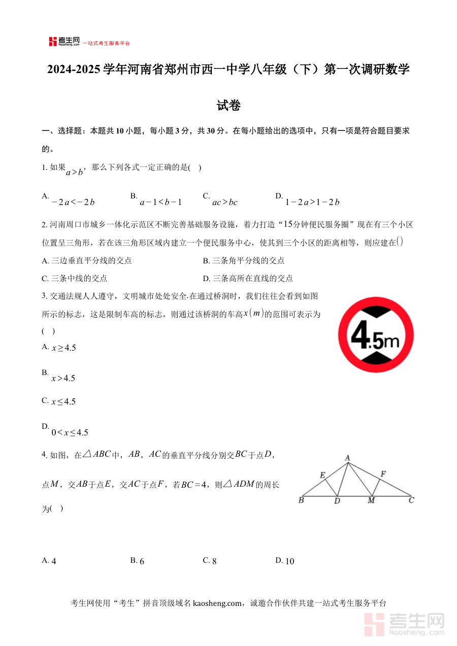 该试卷的适用人群为河南省郑州市西一中学2024—2025学年下学期的八年级学生,其核心价值在于通过阶段性检测帮助学生巩固已学知识、调整学习方法,同时为师生双方提供精准的学习反馈,推动教学与学习的高效衔接,是学期初期数学学习效果评估与备考规划的关键参考资料,对提升学生阶段性学习质量具有积极意义。