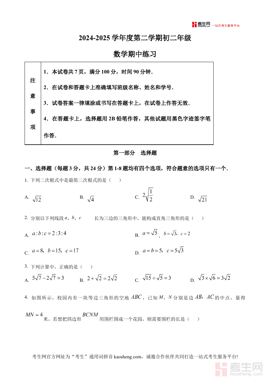 本资料主要适用于北京市海淀区北京理工大学附属中学2024-2025学年八年级下学期学生,也可供具有同类期中数学考试备考需求的学习者使用,通过该资料可增强阶段检测的准备针对性,提升备考规划的科学性,助力学习者更好地应对期中数学考试挑战。