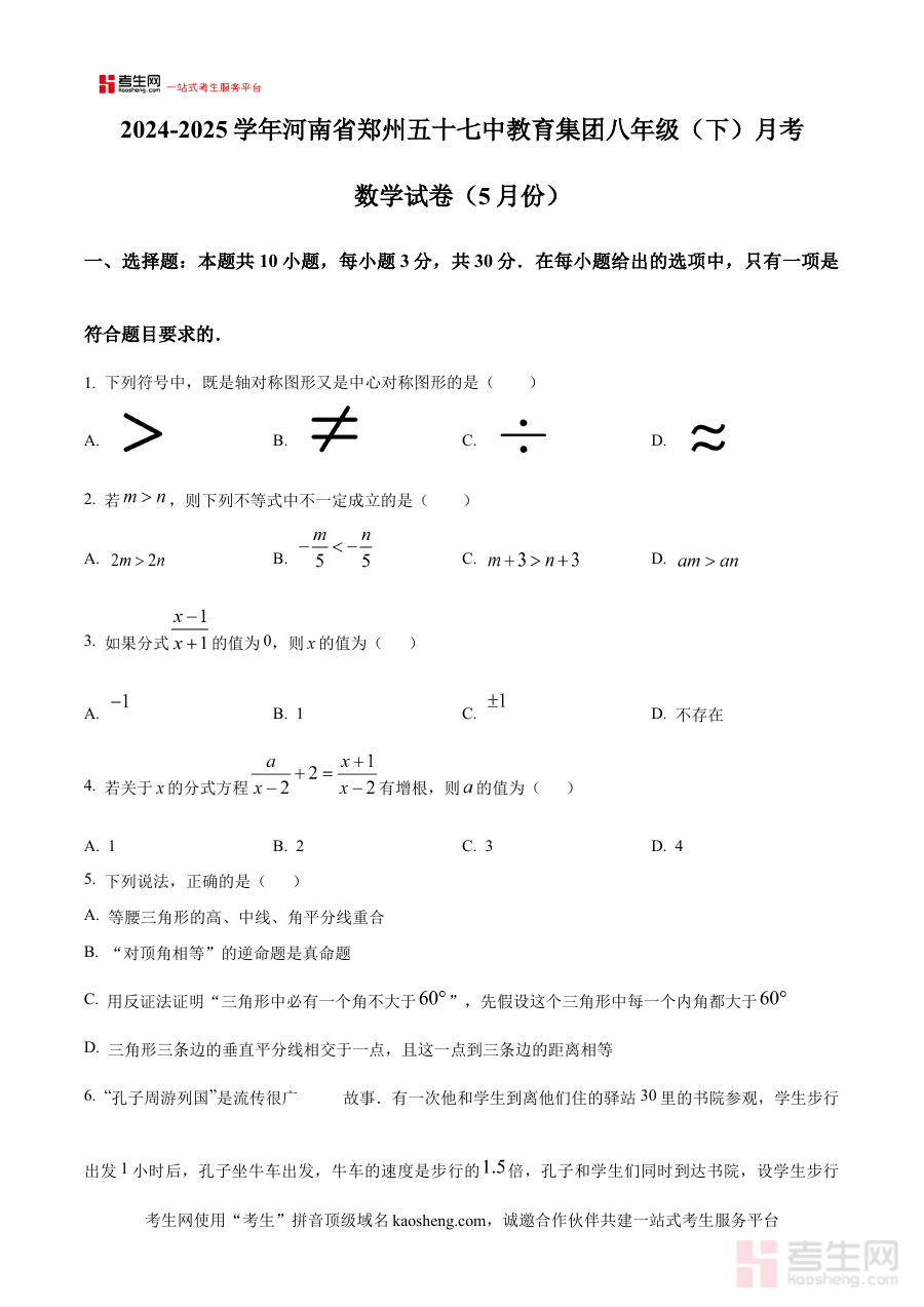《精品解析:河南省郑州五十七中教育集团2024-2025学年八年级下学期月考数学试卷(5月份)(原卷版)》是针对河南省郑州五十七中教育集团2024-2025学年八年级下学期5月份数学月考的原卷版备考资料,依托该教育集团校内教学进度与考试安排,精准对应特定学年、学期及月份的阶段性考试场景,为使用者提供与本校考试直接相关的原始试卷素材。