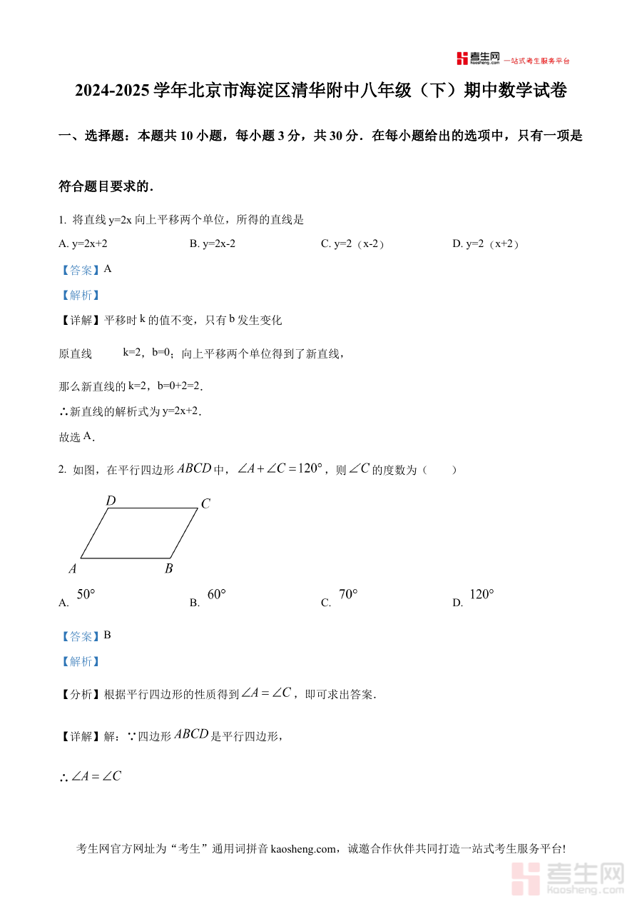 《精品解析:北京市海淀区清华附中2024-2025学年八年级下学期期中考试数学试卷(解析版)》是针对北京市海淀区清华附中2024-2025学年八年级下学期期中考试数学科目的专业备考资料,聚焦该阶段考试的核心考查方向与内容框架,为使用者提供与实际考试高度契合的学习参考依据。