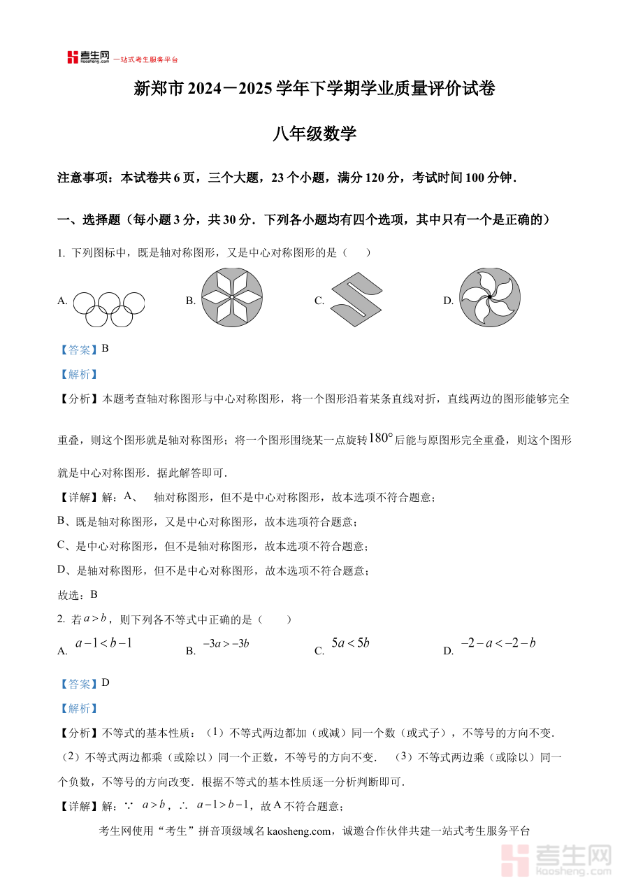 《精品解析:河南省郑州市新郑市2024-2025学年八年级下学期6月期末数学试题(解析版)》是针对河南省郑州市新郑市区域内2024-2025学年八年级下学期6月期末数学考试的专业备考资料,聚焦该地区特定学年段的期末检测需求,为使用者提供与本地考试体系相适配的内容支持。