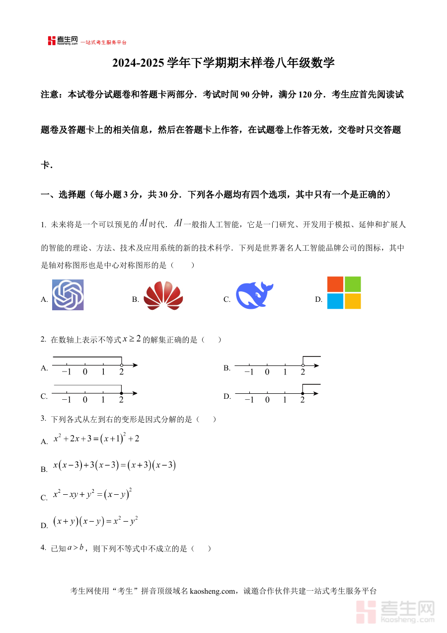 《精品解析:河南省郑州市航空港区2024—2025学年下学期八年级数学期末调研卷(原卷版)》是面向河南省郑州市航空港区2024至2025学年下学期八年级学生的数学期末调研考试备考资料,精准匹配该地区该学年段数学学科期末调研的考试定位与区域需求,为相关学习与备考活动提供贴合实际的资源支撑。