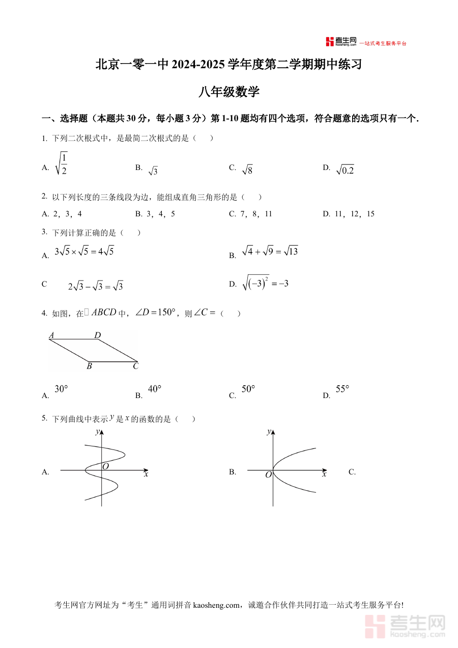 《精品解析:北京市第一零一中学2024~2025学年八年级下学期期中考试数学试卷 (原卷版)》是针对北京市第一零一中学2024至2025学年八年级下学期数学期中考试设计的备考资料,包含该学校该阶段数学期中考试的原卷呈现形式,能够为使用者提供与实际考试直接关联的试卷结构及内容载体信息。