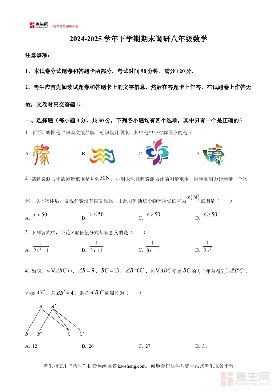 本资料适用于河南省郑州市高新技术产业开发区2024-2025学年八年级学生及数学教师,学生通过使用原卷版试题可提前熟悉期末考的试卷框架与答题流程,教师则能借助其开展阶段学情分析,提升复习教学的精准性与有效性。