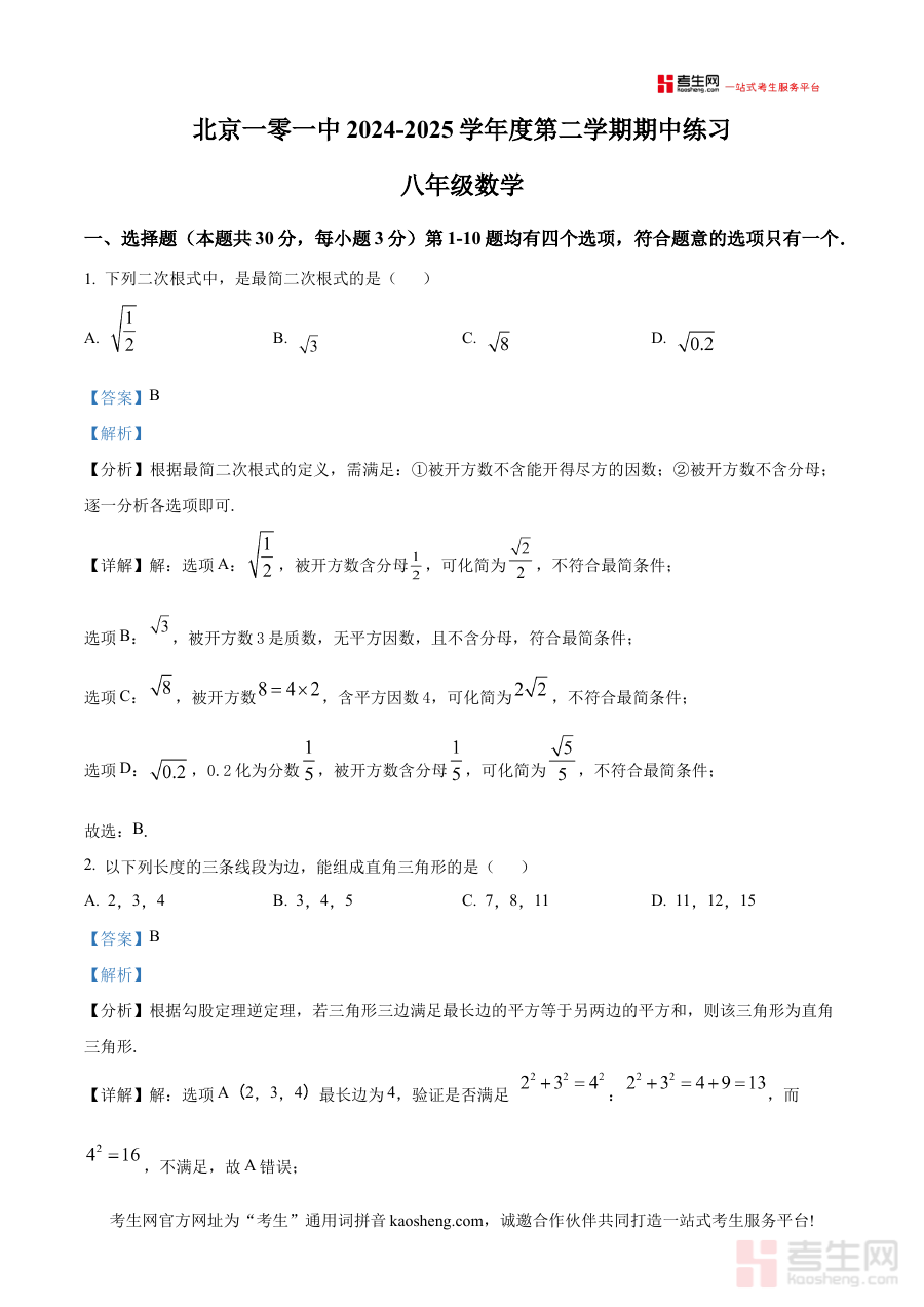 《精品解析:北京市第一零一中学2024~2025学年八年级下学期期中考试数学试卷(解析版)》是面向北京市第一零一中学2024至2025学年八年级下学期学生及教师推出的数学期中检测配套解析资料,精准对应该学校该学年第二学期的数学期中考查内容,为使用者提供了与校内期中测试直接关联的专业参考资源。