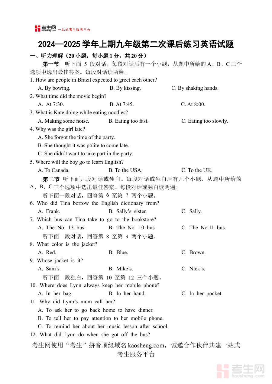 《2024-2025学年上期九年级第二次课后练习英语试题》是针对2024至2025学年第一学期九年级学生设计的英语课后练习资料,属于阶段性课后检测类素材。该资料紧密贴合当前学年上期九年级英语的学习进度,为学生提供了与近期所学内容相匹配的实践机会,旨在帮助学生巩固课堂所学的英语知识,是九年级学生英语学习过程中的重要辅助材料。