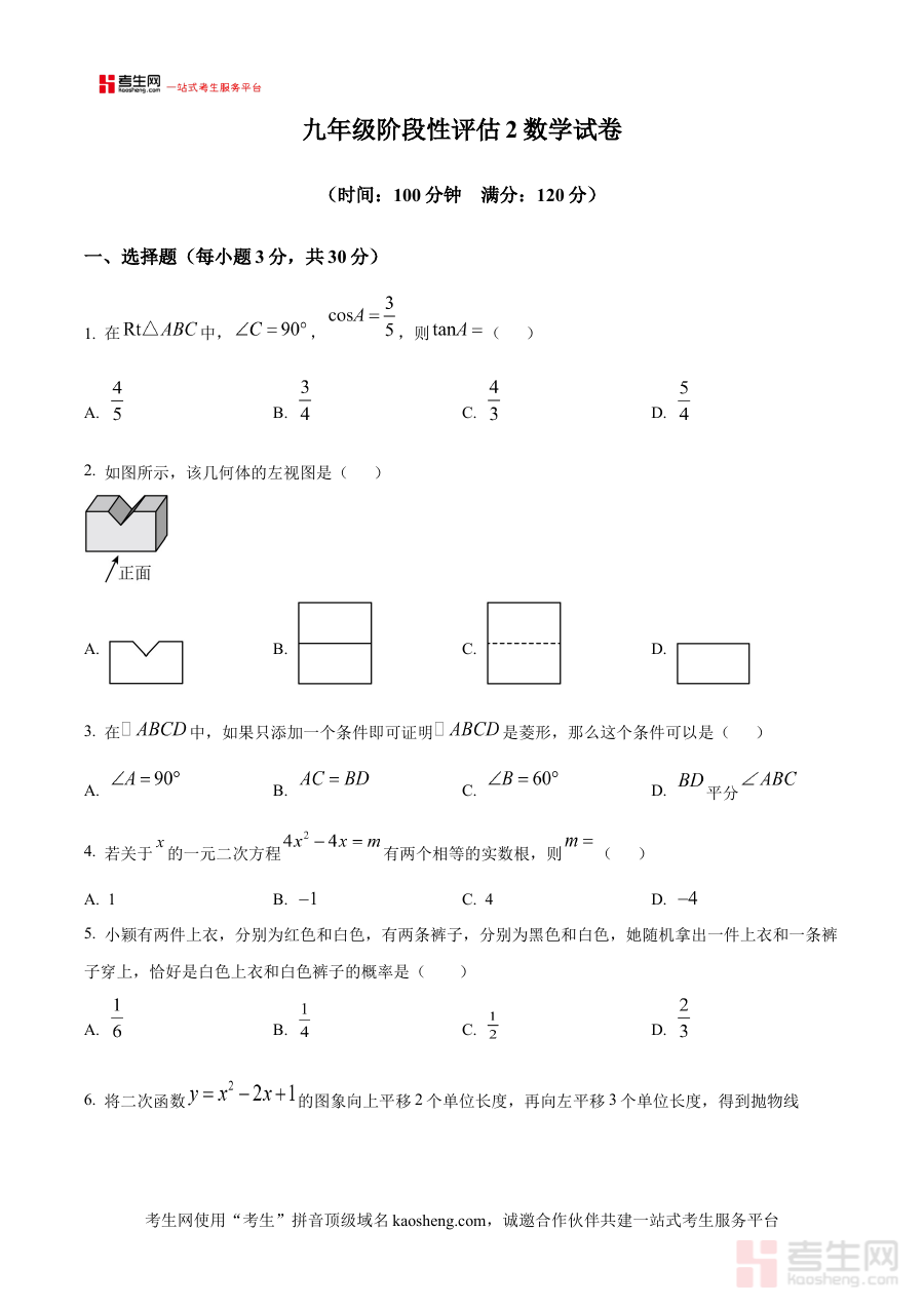 本资料适用于河南省实验中学及同类学校的九年级学生、数学教师以及关注九年级数学阶段学习的教育工作者。对于学生而言,它是进行阶段学习效果自我检测、熟悉考试形式的理想材料;对于教师来说,它能够助力教学评估、优化备考指导方案;对于教育工作者,则可作为研究阶段考试命题趋势与教学衔接的参考样本,整体提升阶段复习与教学的质量。