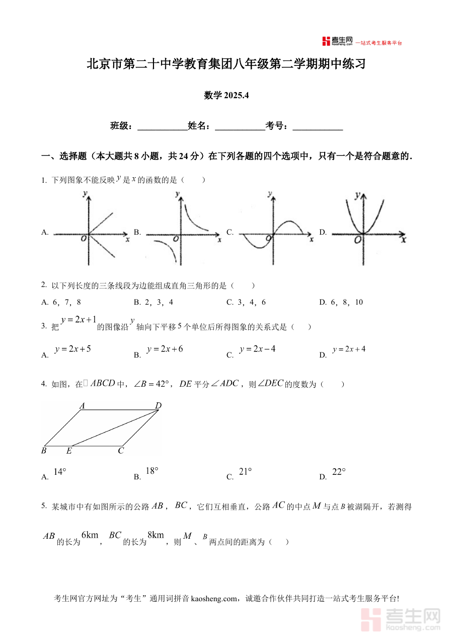 《精品解析:北京市第二十中学教育集团2024—2025学年八年级下学期期中练习 数学 (原卷版)》是针对北京市第二十中学教育集团在2024—2025学年面向八年级学生开展的下学期期中练习所设计的数学学科原卷版备考资料。该资料精准对应该教育集团本学年八年级下学期数学学科的期中练习场景,以原卷形式完整呈现练习内容载体,能够帮助使用者直接接触到与实际练习一致的考查形式和结构,是贴合该阶段数学学习进度、满足期中备考需求的针对性资源。