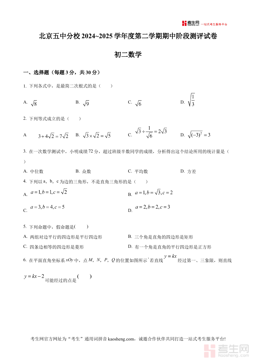 《精品解析:北京市第五中学分校2024~2025学年下学期期中阶段测评八年级数学试卷(原卷版)》是针对北京市第五中学分校2024至2025学年下学期八年级数学期中阶段测评设计的备考资料,贴合该时段学校教学进度与阶段测评要求,为学生提供与实际考试场景一致的原卷内容。