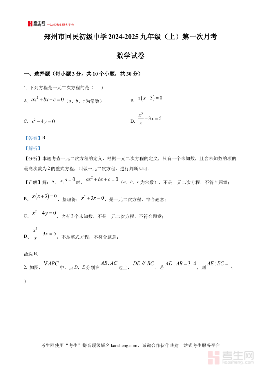 《精品解析:河南省 郑州市回民初级中学2024-2025学年上学期九年级数学第一次月考试卷(解析版)》是针对河南省郑州市回民初级中学2024-2025学年上学期九年级数学学科第一次月考的专项备考资料,聚焦该阶段数学学习的阶段性考查需求,依托学校特定学期的月考设置提供针对性解析内容。