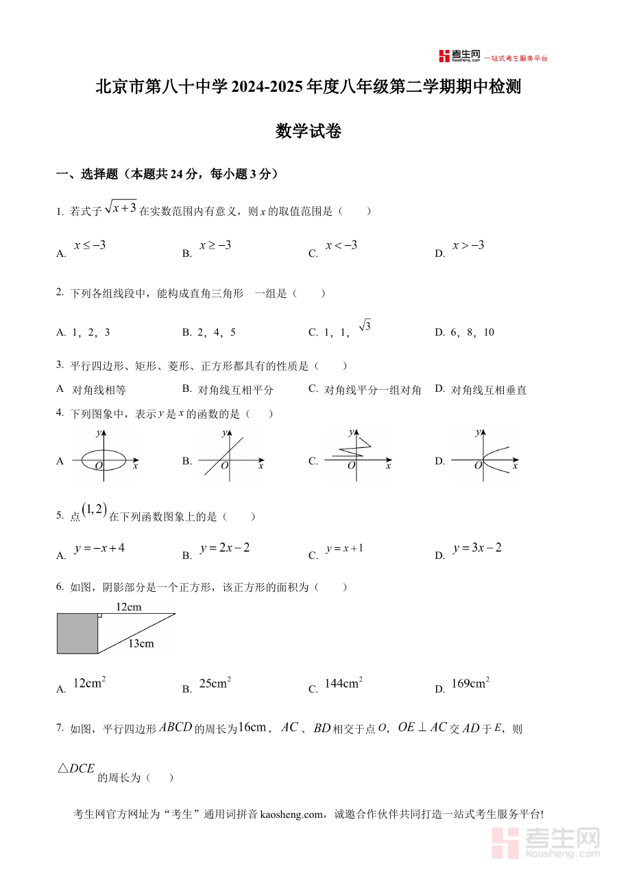 《精品解析:北京市第八十中学2024—2025学年下学期八年级期中数学试题(原卷版)》是针对北京市第八十中学2024至2025学年下学期八年级学生期中数学考试的专用备考资料。该资料贴合该校该阶段数学教学进度与期中检测要求,为使用者提供符合学校教学实际的考试内容参考依据。