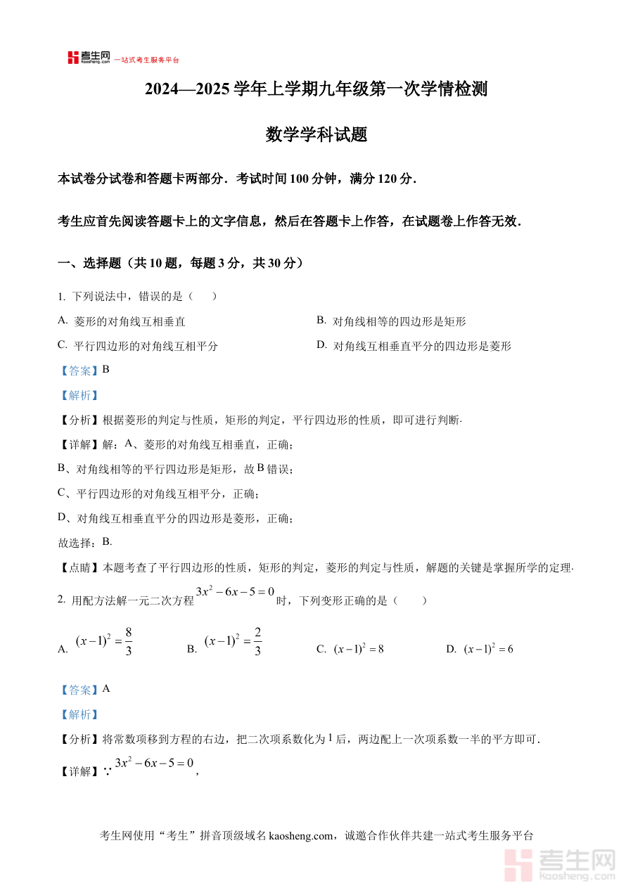 《精品解析:河南省 郑州市第七初级中学 2024-2025学年 九年级上学期10月数学月考卷 (解析版)》是针对2024-2025学年河南省郑州市第七初级中学九年级上学期10月数学月考的专业备考资料,紧密贴合该阶段九年级数学的学习进度与学校特定的考试要求,为使用者提供与本次月考实际考查内容高度匹配的详细解析,帮助使用者快速把握考试的核心方向与考查要点,是对接本次月考的重要辅助材料。