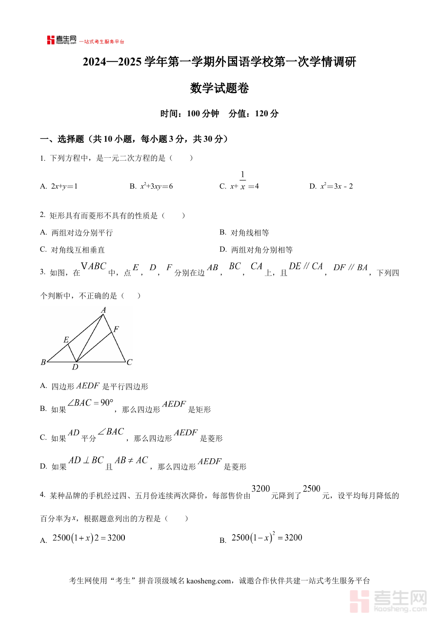 《精品解析:河南省郑州经济技术开发区外国语学校2024-2025学年九年级上学期第一次月考数学试卷(原卷版)》是针对河南省郑州经济技术开发区外国语学校2024-2025学年九年级上学期第一次月考设计的数学学科备考资料,精准匹配该校该阶段的月度教学检测需求,为师生提供贴合本地校考实际的参考载体。