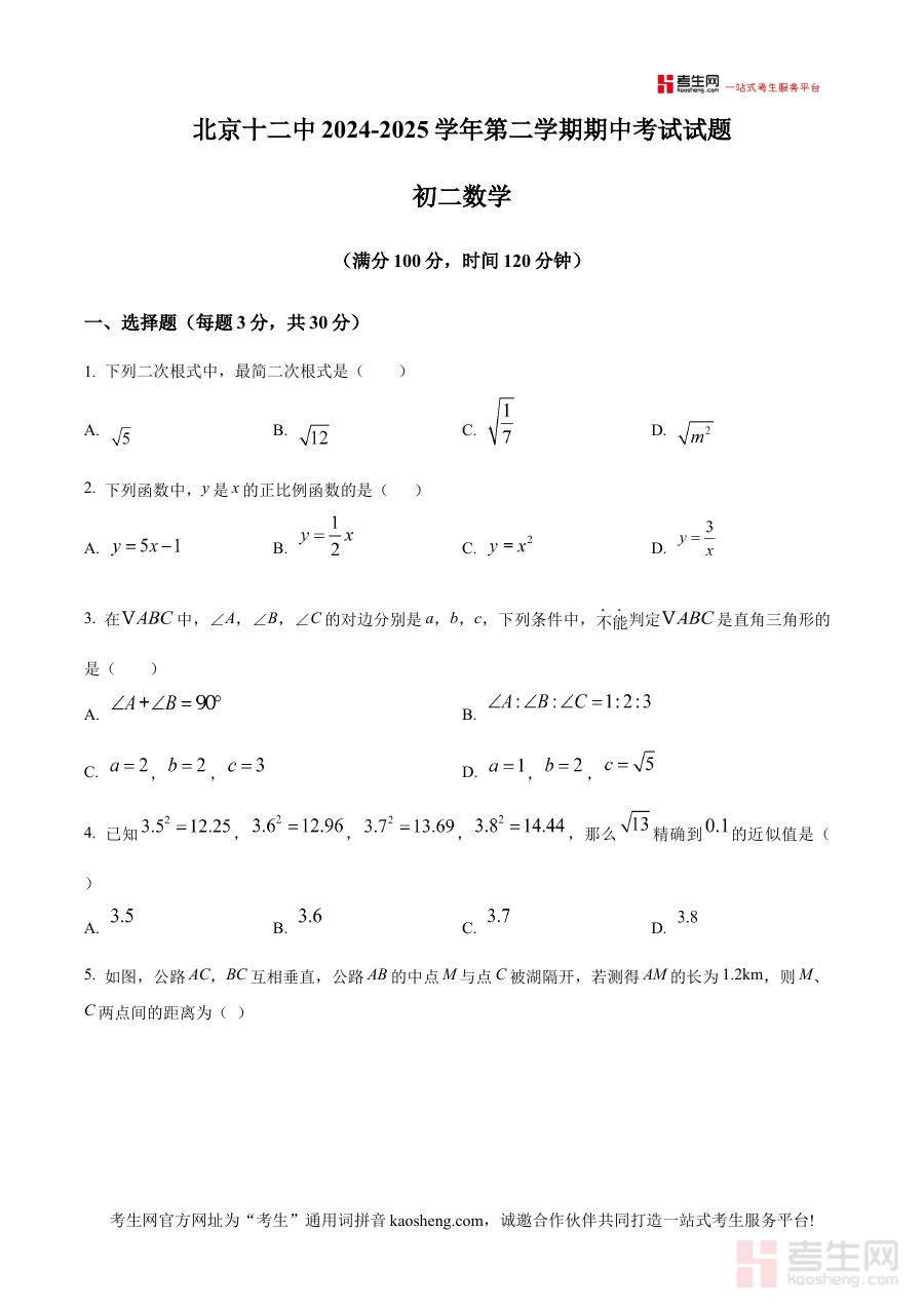 《精品解析:北京市第十二中学2024-2025学年八年级下学期数学期中试卷(原卷版)》是2024至2025学年期间,北京市第十二中学针对八年级下学期学生推出的数学学科期中检测备考资料。该资料精准对应校内期中考试的时间节点与年级学段,为学生提供与本校期中检测直接匹配的练习载体,帮助学生提前接触符合校内教学进度与考查要求的试卷形式。