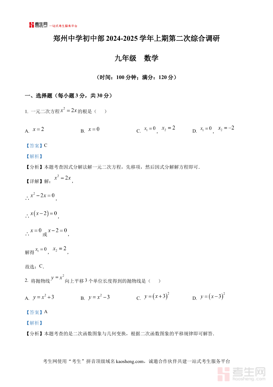 《精品解析:河南省郑州中学2024-2025学年九年级上学期第二次数学综合调研试卷(12月份)(解析版)》是针对河南省郑州中学2024至2025学年九年级上学期12月份开展的第二次数学综合调研考试的配套备考资料,聚焦该阶段数学学科的综合检测需求,为相关使用者提供专业的解析支持。