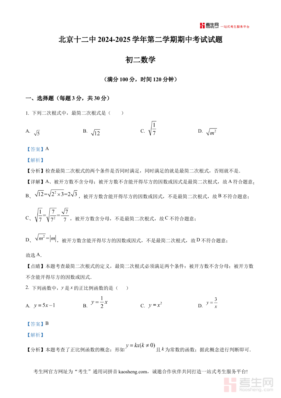 《精品解析:北京市第十二中学2024-2025学年八年级下学期数学期中试卷(解析版)》是针对北京市第十二中学特定学年学段的数学期中检测配套资料,明确对应2024-2025学年八年级下学期的数学期中考试内容,作为解析版资料,其核心价值在于为相关使用者提供与该考试直接匹配的备考支持,精准服务于该学校该学段师生的期中备考需求。