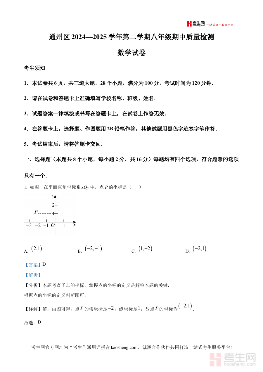 《精品解析:北京市通州区2024-2025学年八年级下学期期中数学试题(解析版)》是针对北京市通州区2024至2025学年第二学期八年级数学期中阶段考试的专业备考资料,精准匹配该地区该学年八年级下学期数学学科的期中检测需求与本地教学实际情况,为使用者提供与教学进度、考试要求及考查方向高度契合的参考内容,助力全面把握期中阶段数学学习的核心要点。