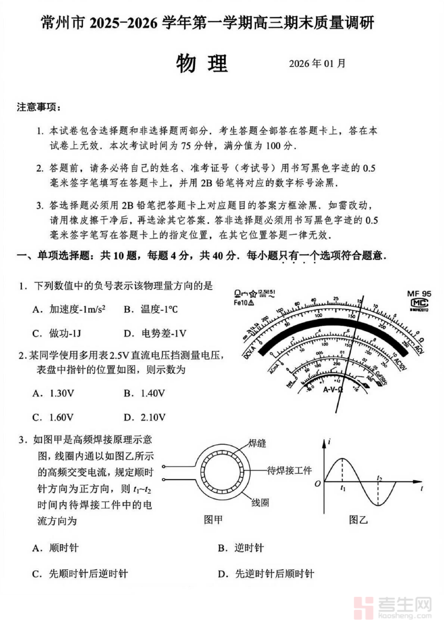 《常州市2025-2026学年第一学期高三期末质量调研物理+答案》是针对江苏省常州市2025至2026学年第一学期高三年级物理学科期末质量调研的配套备考资料。该资料对应高三上学期期末阶段的官方质量检测活动,整合了调研试卷与参考答案两部分核心内容,为高三学生及教师提供了与本地教学进度、考试要求高度匹配的参考资源,能够直接反映当前阶段常州高三物理教学的评估方向与标准。