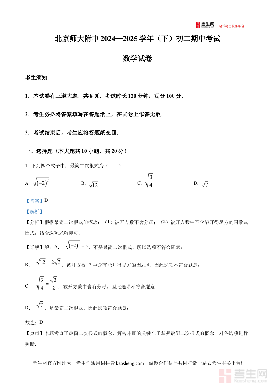 本资料主要适用于北京师范大学附属中学2024-2025学年下学期的八年级学生,也可供该学段的数学教师及学生家长使用;其解析内容能帮助学生在期中备考阶段精准把握复习重点,提升阶段检测的有效性,助力学生优化备考规划,为后续数学学习奠定坚实基础。