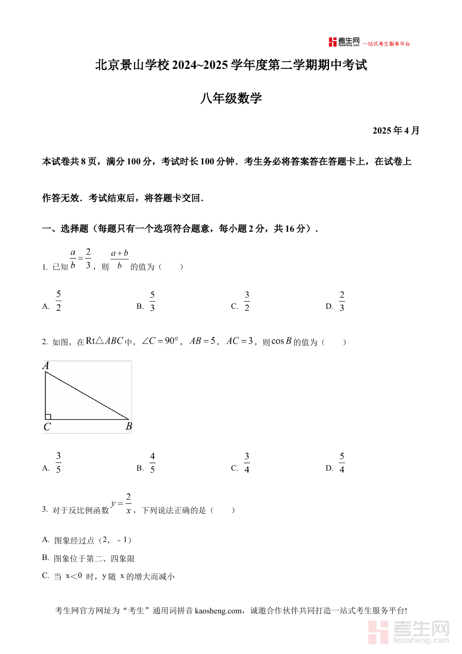 《精品解析:北京景山学校2024~2025学年下学期期中考试 八年级数学试题(原卷版)》是针对北京景山学校2024至2025学年下学期八年级数学期中考试设计的专用备考资料,精准匹配该学年下学期期中检测的时间节点与校域教学特点。该资料以原卷形式呈现,能够真实还原学校期中考试的命题风格与考查维度,为使用者提供与实际考试高度契合的练习资源,助力其提前熟悉考试场景与要求。
