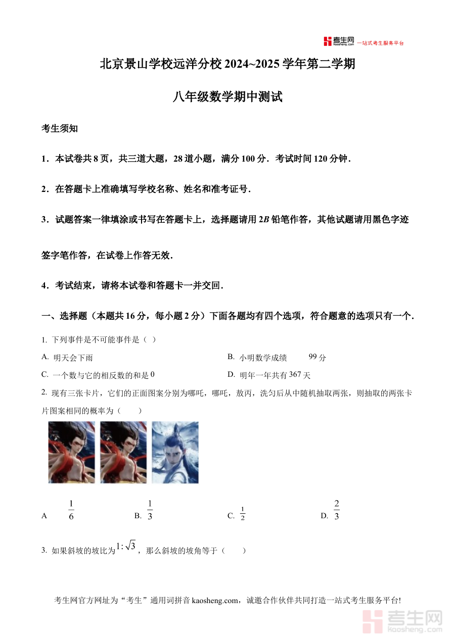 本资料主要适用于北京景山学校远洋分校2024—2025学年下学期的八年级学生,作为期中测试原卷资源,其能真实呈现该校期中测试的考查形式与标准,对学生进行阶段检测和科学备考规划具有重要参考价值,助力学生提前适应考试场景并针对性提升学习效果。