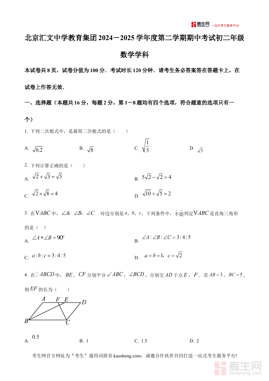 本资料适用于北京汇文中学2024-2025学年八年级下学期的学生及相关教师、家长;其原卷版属性确保内容的权威性与针对性,能有效助力学生熟悉考试要求、提升备考效率,为阶段性学习成果的检验与提升提供有力支持。