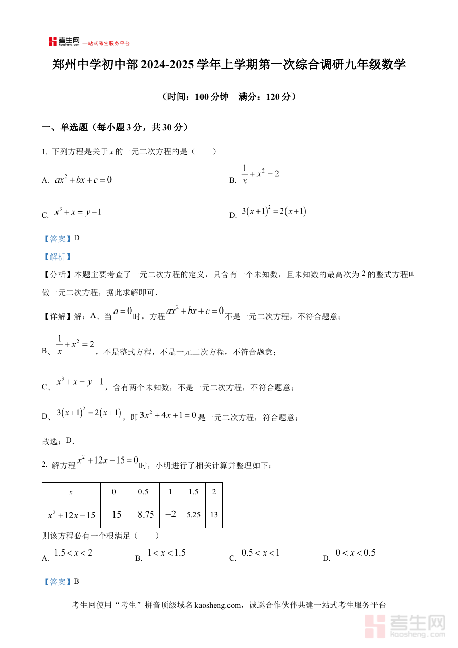 《精品解析:河南省郑州市郑州中学2024-2025学年上学期九年级第一次月考数学试卷(解析版)》是聚焦河南省郑州市郑州中学特定学年学期九年级数学第一次月考的专业备考资料,它依托该校该阶段数学教学进度与月考考查标准,为使用者提供了贴合实际考试场景的试卷内容及详尽解析,能够帮助使用者精准把握该次月考的考查重点与命题方向,为后续备考奠定基础。