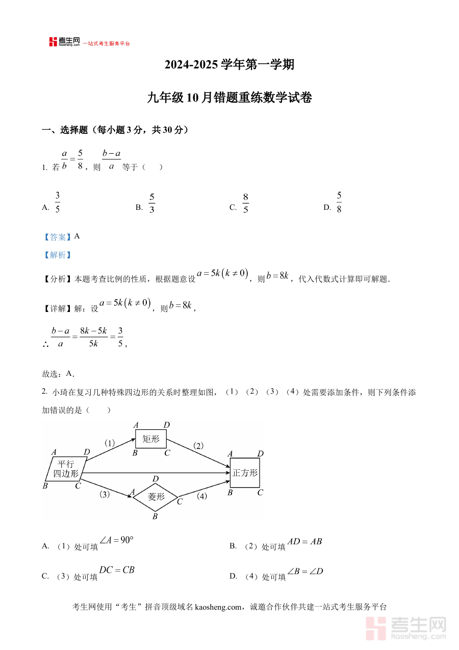 此资料主要适用于河南省郑州市郑州实验外国语中学的九年级学生群体,也可作为该年级数学教师开展教学评估、制定备考计划的重要参考工具;通过对本次10月联考数学试题的详细解析,学生能直观了解自身在当前学习阶段的知识掌握程度,教师则可利用资料优化教学安排,共同增强阶段学习与教学的针对性和有效性。