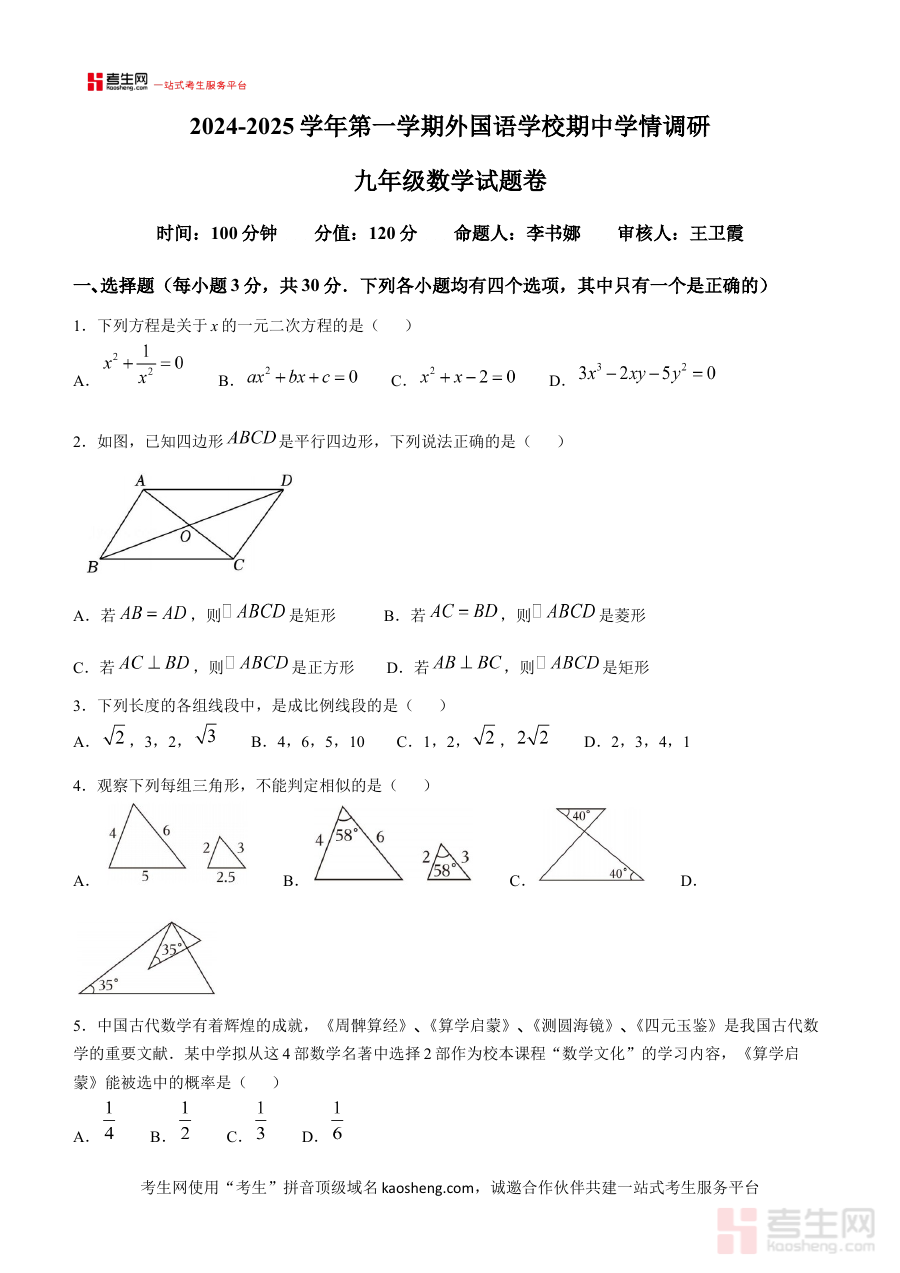 《河南省郑州市外国语中学2024——2025学年上学期期中考试九年级数学试卷》是面向河南省郑州市外国语中学2024至2025学年第一学期九年级学生的期中考试数学备考资料,精准匹配该校该学年上学期中期数学考查的时间节点与教学要求,为学生提供贴合本校考试标准的练习资源。