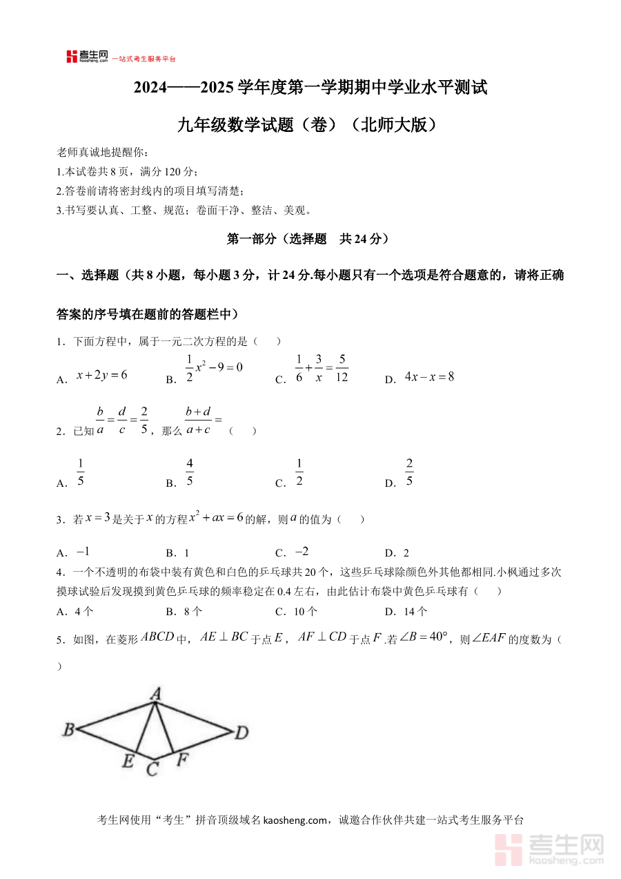 本资料适用于河南省郑州市第十一初级中学2024至2025学年的九年级学生,通过针对性的练习与检测,能够帮助学生巩固上学期期中阶段的数学知识,提升应对期中考试的信心,对优化个人备考策略、实现阶段学习目标具有积极意义。