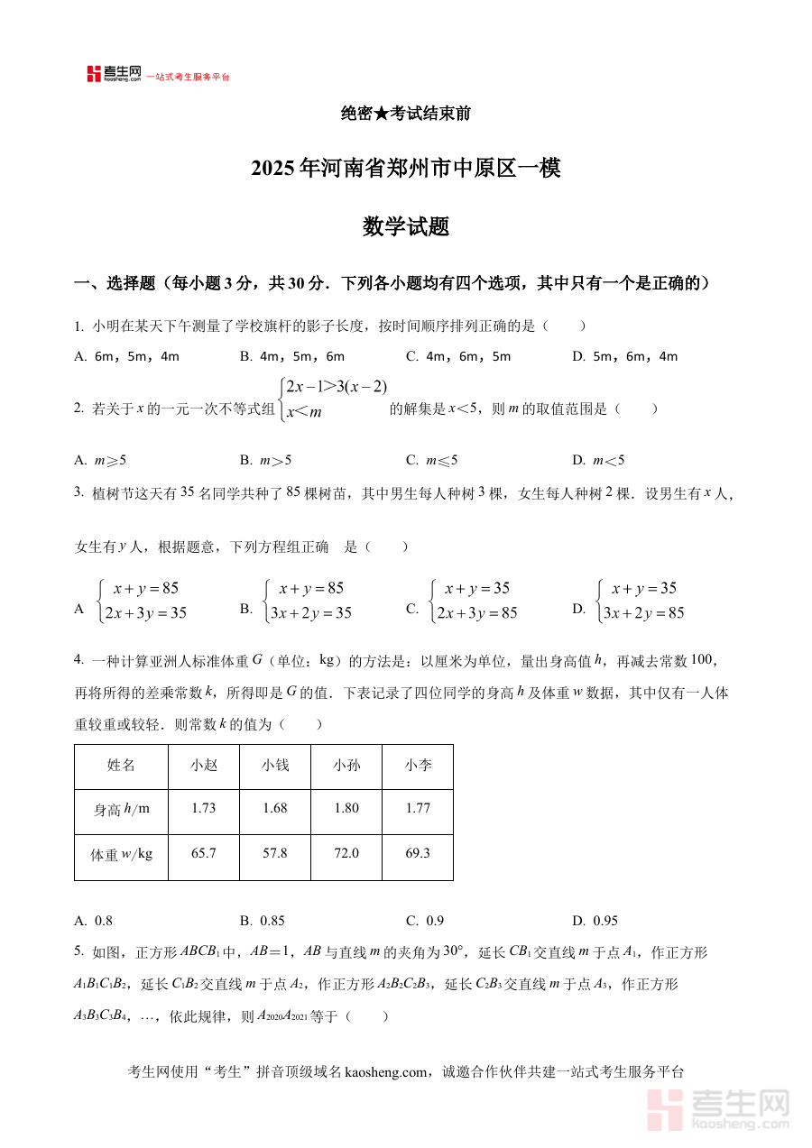 《精品解析:2025年河南省郑州市中原区中考一模数学试题(原卷版)》是针对2025年河南省郑州市中原区初中毕业生学业水平第一次模拟考试设计的数学学科原卷资料,属于中考备考阶段的核心参考材料,能够精准反映该区域中考一模的考试背景与命题框架。