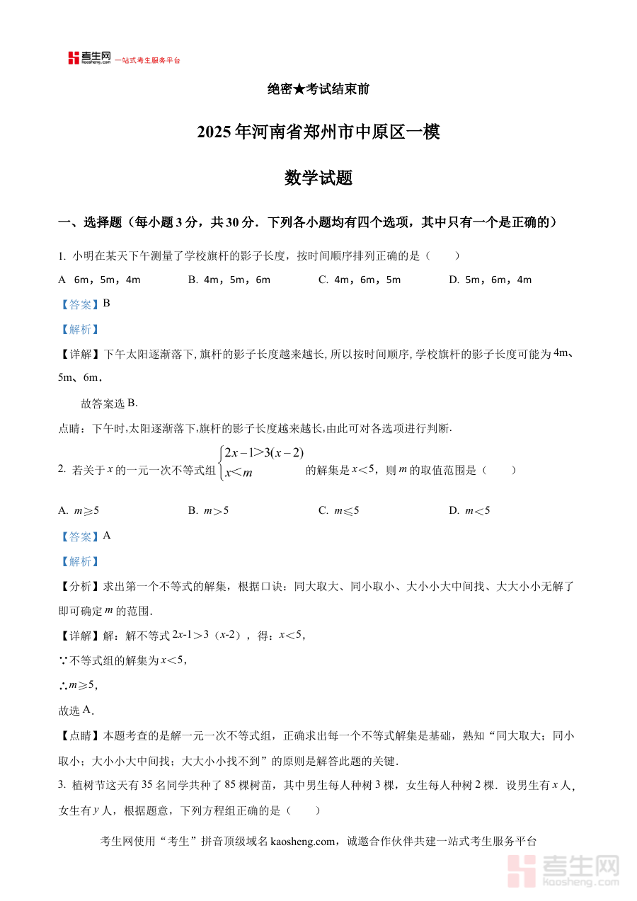 《精品解析:2025年河南省郑州市中原区中考一模数学试题(解析版)》是针对2025年河南省郑州市中原区中考第一次模拟考试编制的数学学科备考资料。该资料紧密贴合当地中考备考的阶段性需求,结合区域教育教学实际与命题趋势,为使用者提供了具有区域针对性的参考内容。作为中考前重要的模拟测试辅助材料,它能够帮助相关人群提前熟悉考试形式与区域命题风格,为后续备考奠定基础。