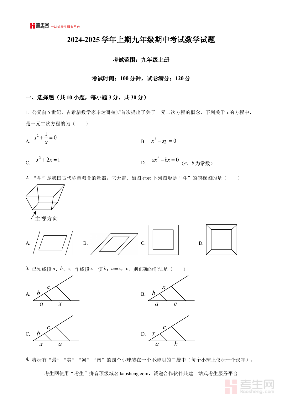 该资料可用于九年级学生进行阶段学习成果的自我检测,帮助教师开展学情诊断与教学调整,同时为学生制定个性化备考规划提供真实的考试情境支持,助力师生把握期中阶段的数学学习重点与方向。